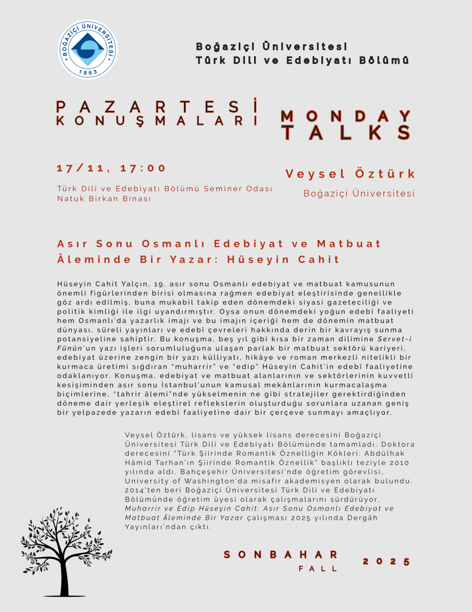 Asır Sonu Osmanlı Edebiyat ve Matbuat Âleminde Bir Yazar: Hüseyin Cahit (Veysel Öztürk, 17 Kasım Pazartesi, 17.00)