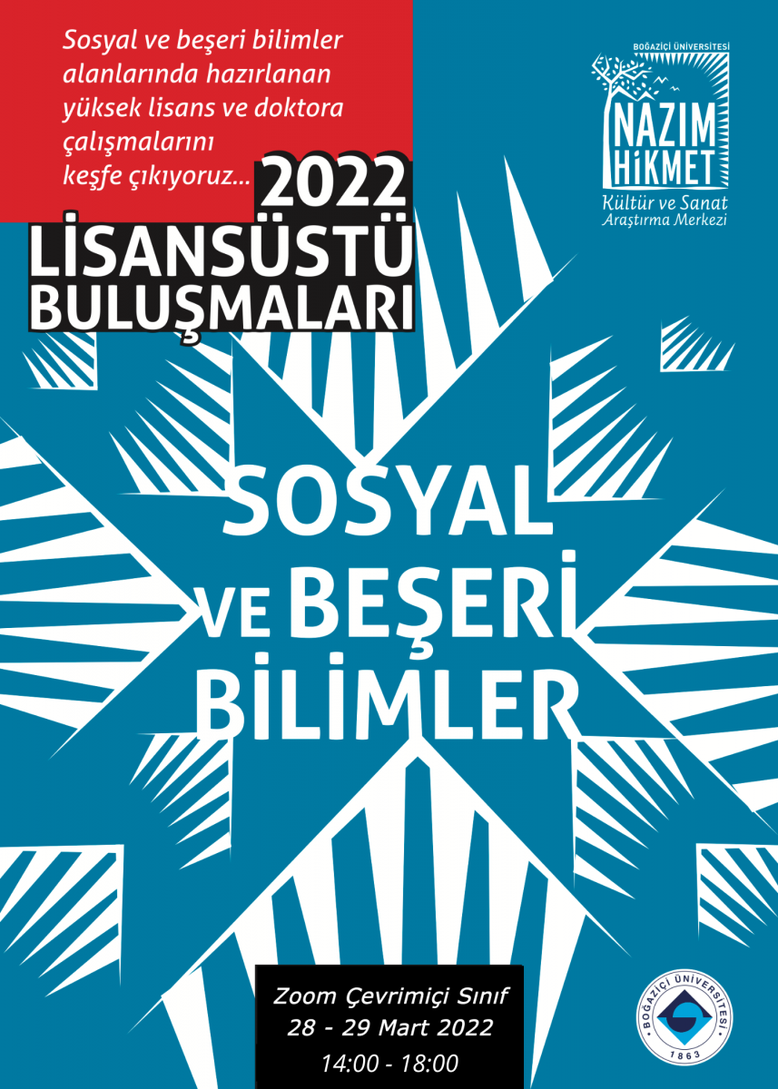 Boğaziçi Üniversitesi Nâzım Hikmet Kültür ve Sanat Araştırma Merkezi olarak, sosyal ve beşeri bilimler alanlarında çalışmalarını sürdüren yüksek lisans ve doktora öğrencilerinin tanışabileceği ve araştırmalarını paylaşabileceği geniş katılımlı Lisansüstü Buluşmaları sempozyumunun yedincisini, 28 ve 29 Mart 2022’de Ahmet Ersoy başkanlığında düzenliyoruz.
