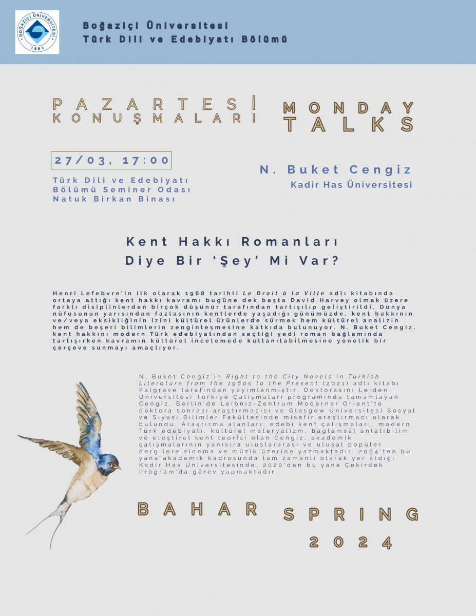 Pazartesi Konuşmaları’nın bir sonraki konuğu “Kent Hakkı Romanları Diye Bir ‘Şey’ mi Var?” başlıklı konuşmasıyla N. Buket Cengiz. Konuşma, 27 Mart Çarşamba günü saat 17:00’de, Türk Dili ve Edebiyatı Bölümü seminer odasında!