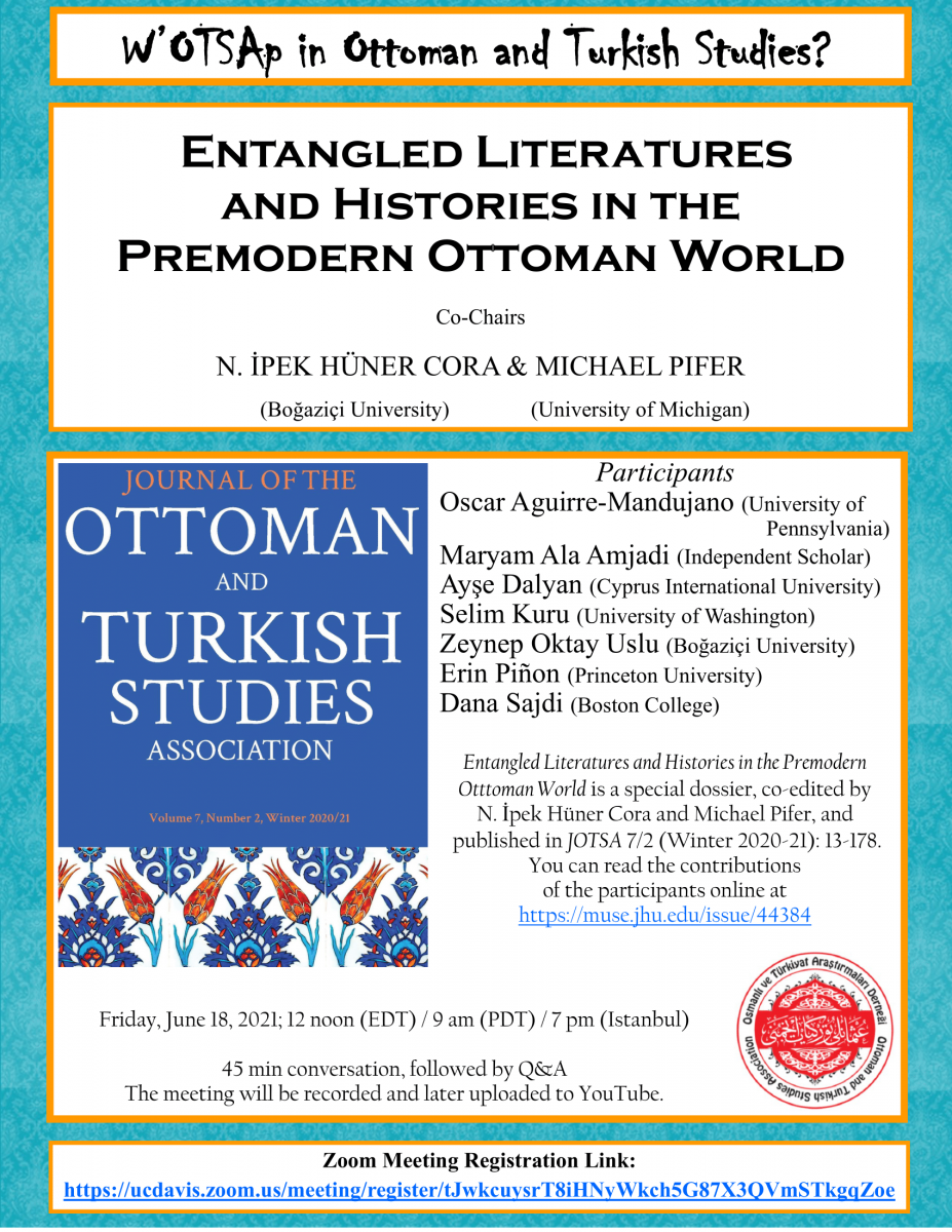 İpek Hüner Cora and Michael Pifer, the co-editors of Entangled Literatures and Histories in the Pre-Modern Ottoman World, a special dossier published in JOTSA 7/2 (Fall 2020), will host the contributors, (in alphabetical order of last names) Oscar Aguirre-Mandujano, Maryam Ala Amjadi, Ayşe Dalyan, Selim Kuru, Zeynep Oktay Uslu, Erin Piñon, and Dana Sajdi.