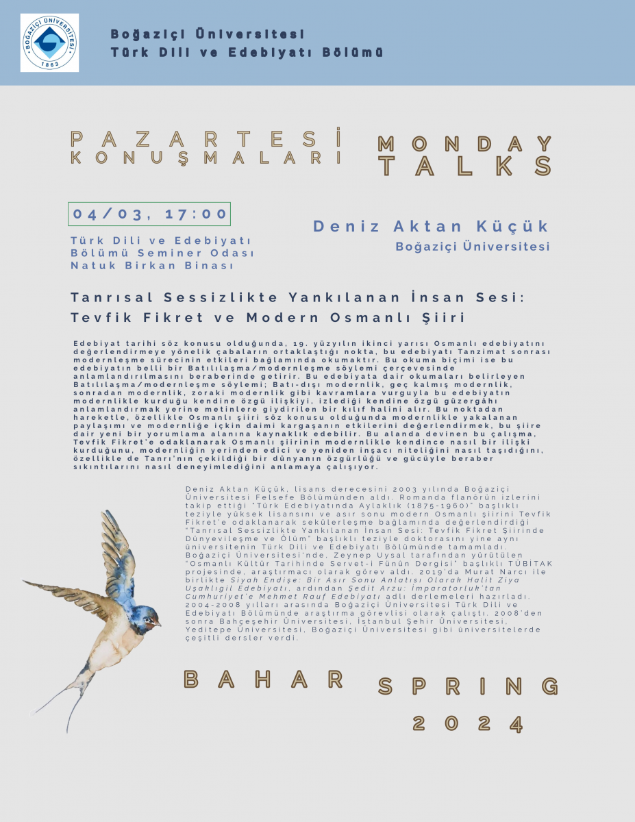 Bu dönemki Pazartesi Konuşmaları, Deniz Aktan Küçük’ün "Tanrısal Sessizlikte Yankılanan İnsan Sesi: Tevfik Fikret ve Modern Osmanlı Şiiri" başlıklı konuşmasıyla başlıyor! Konuşma 4 Mart’ta, saat 17:00’de, Natuk Birkan Binası’ndaki Türk Dili ve Edebiyatı Bölümü seminer odasında. Boğaziçi mensubu olmayanların kampüse girebilmek için tkl@bogazici.edu.tr adresine e-posta göndermeleri gerekmektedir.