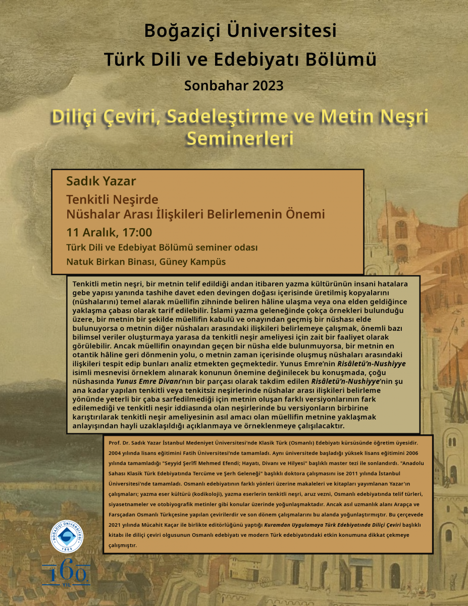 Diliçi Çeviri, Sadeleştirme ve Metin Neşri Seminerleri’nin bu dönemki son konuğu “Tenkitli Neşirde Nüshalar Arası İlişkileri Belirlemenin Önemi” başlıklı konuşmasıyla Sadık Yazar. Konuşma, 11 Aralık Pazartesi saat 17:00’de Türk Dili ve Edebiyatı Bölümü seminer odasında olacak. Boğaziçi Üniversitesi mensubu olmayanların kampüse girebilmek için tkl@boun.edu.tr adresine e-posta göndermeleri gerekmektedir.