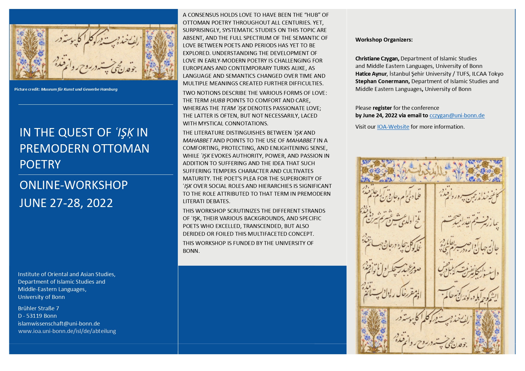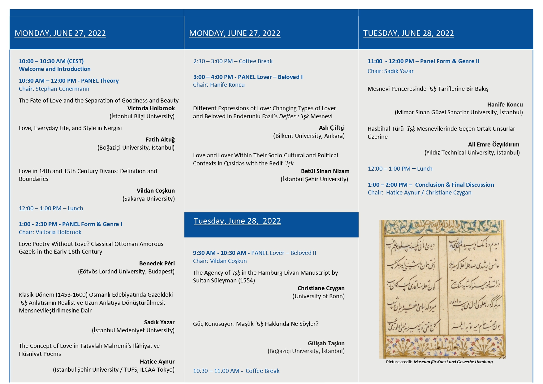Bölüm hocalarımızdan Fatih Altuğ'un "Love, Everyday Life and Style in Nergisi" ve Gülşah Taşkın'ın "Güç Konuşuyor: Maşûk 'Işk Hakkında Ne Söyler?" başlıklı bildileriyle katkıda bulunacağı atölye Bonn Üniversitesi'nin ev sahipliğinde 27-28 Haziran 2022'de gerçekleşecek. Katılım için 24 Haziran'a kadar cczygan@uni-bonn.de adresine e-posta göndererek kaydolmanız gerekmektedir. Etkinlik programını aşağıda bulabilirsiniz.
