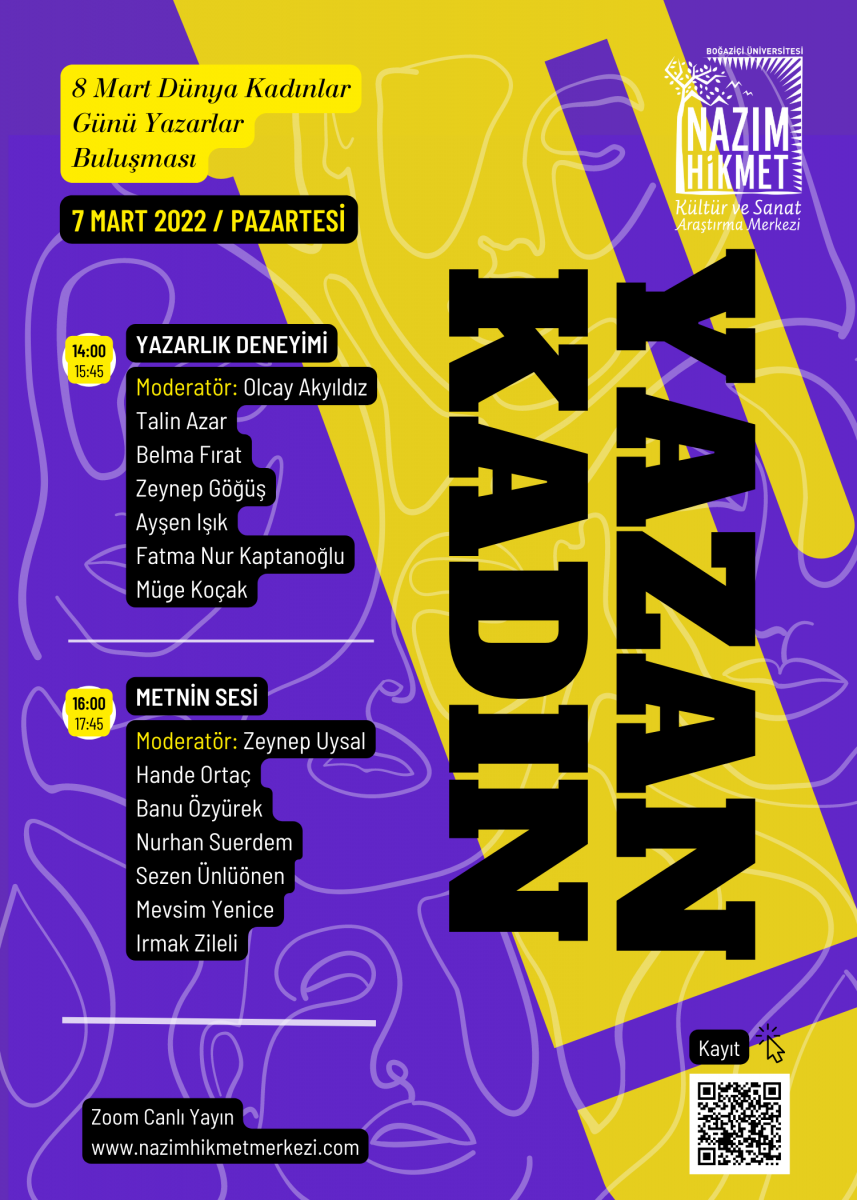 Bu ve benzeri soruları, meseleleri eleştirmenlere ve akademisyenlere değil de edebiyatı yaratan öznelere yani yazarlara sormak istedik. Onların yazarlık deneyimlerini, metinle mücadelelerini, kadın yazar kavramı ve etrafındaki tartışmalar hakkında ne düşündüklerini, bugünün dünyasında kadın olarak yazmayı konuşacağımız yazarlar buluşması 7 Mart 2022 Pazartesi günü saat 14:00-17:45 arasında Olcay Akyıldız ve Zeynep Uysal moderatörlüğünde iki panel olarak gerçekleşecek. Günümüz edebiyatının yükselen isimleri Talin Azar, Belma Fırat, Zeynep Göğüş, Ayşen Işık, Fatma Nur Kaptanoğlu, Müge Koçak, Hande Ortaç, Banu Özyürek, Nurhan Suerdem, Sezen Ünlüönen, Mevsim Yenice ve Irmak Zileli aramızda olacak.