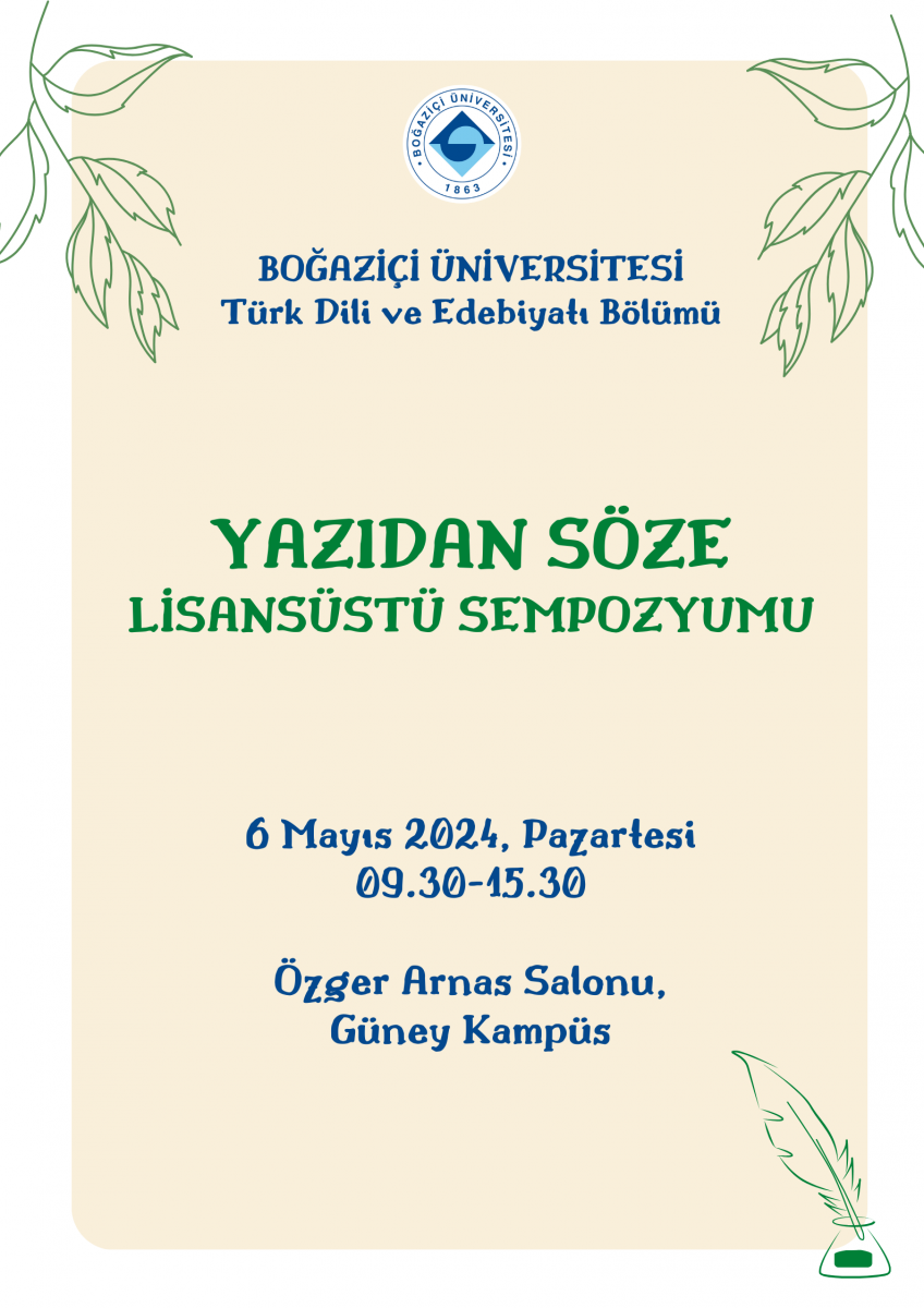 Bölümümüzün düzenlediği geleneksel Yazıdan Söze Lisansüstü Sempozyumu bu yıl 6 Mayıs Pazartesi günü Güney Kampüs’te, Özger Arnas Salonu’nda!