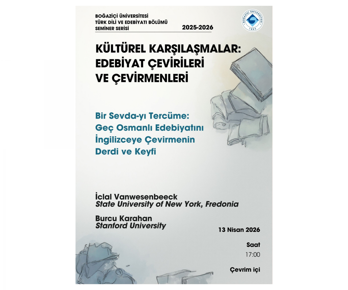 Kültürel Karşılaşmalar: Edebiyat Çevirileri ve Çevirmenleri-"Bir Sevda-yı Tercüme: Geç Osmanlı Edebiyatını İngilizceye Çevirmenin Derdi ve Keyfi”- İclal Vanwesenbeeck ve Burcu Karahan, 13 Nisan Pazartesi, 17.00, Çevrim içi (Link için tıklayınız.)