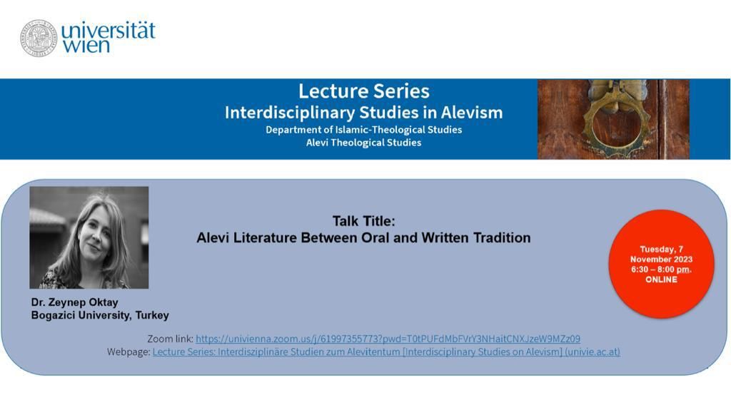 Bölümümüzün hocalarından Zeynep Oktay, 7 Kasım 2023 tarihinde Viyana Üniversitesi’nde “Alevi Literature Between Oral and Written Tradition” başlıklı bir konuşma yapacaktır. Bölgesel saatle 18:30’da başlayacak konuşmaya katılmak için lütfen tıklayınız.