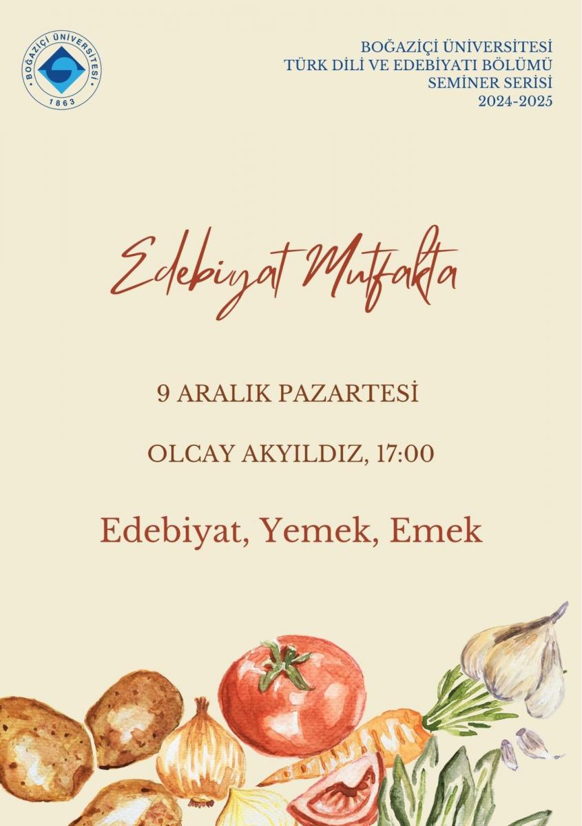 Edebiyat Mutfakta seminer serisinin bir sonraki konuğu “Edebiyat, Yemek, Emek” başlıklı konuşmasıyla Olcay Akyıldız! Konuşma 9 Aralık'ta, saat 17.00’de, Natuk Birkan Binası'ndaki Türk Dili ve Edebiyatı Bölümü seminer odasında olacak.