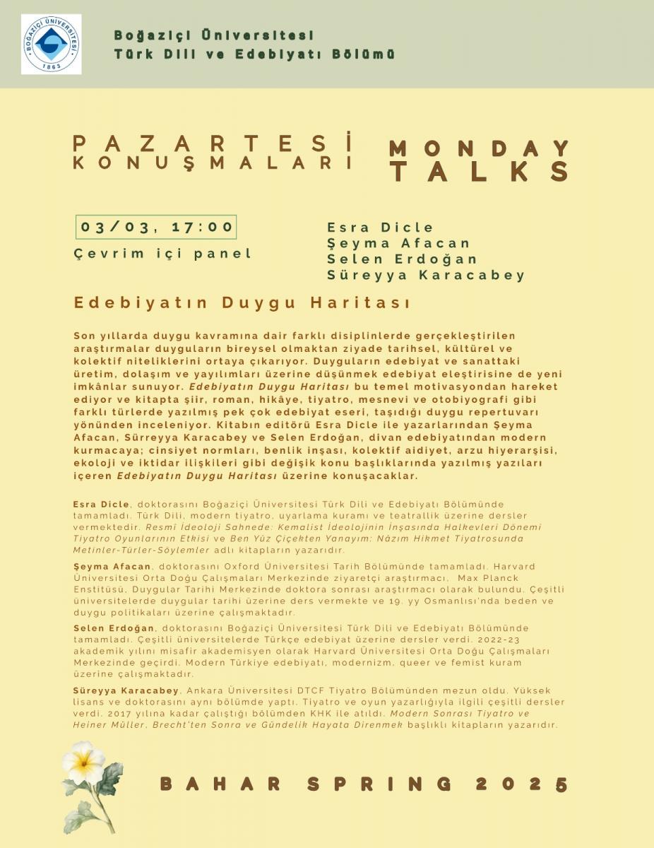 Bu dönemki Pazartesi Konuşmaları serisi, Esra Dicle, Şeyma Afacan, Selen Erdoğan ve Süreyya Karacabey’in konuk olacağı çevrim içi bir panelle başlıyor. Edebiyatın Duygu Haritası 3 Mart Pazartesi günü saat 17.00’de! Katılmak için tıklayınız.