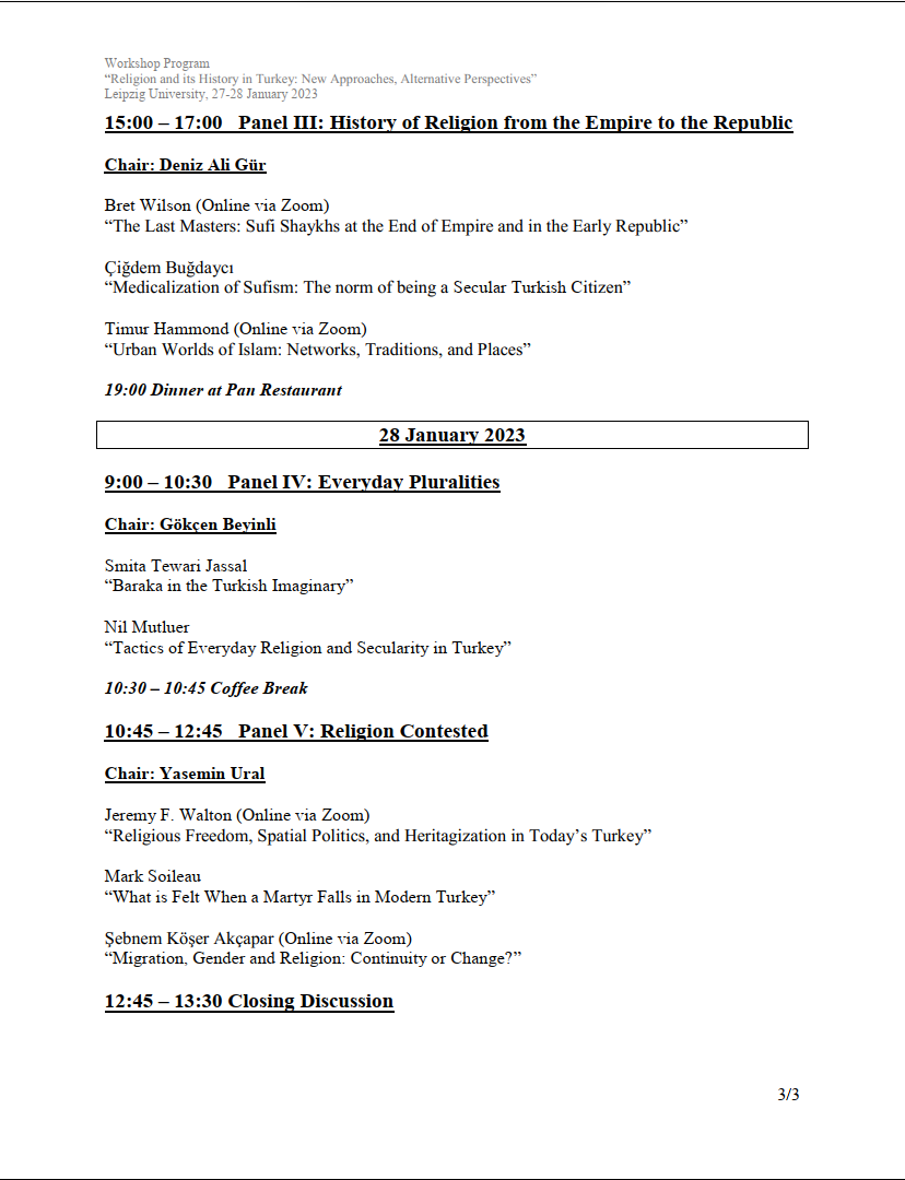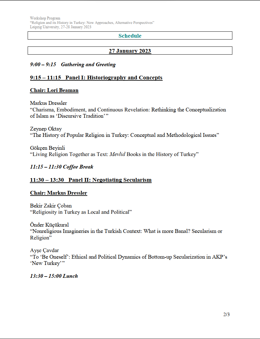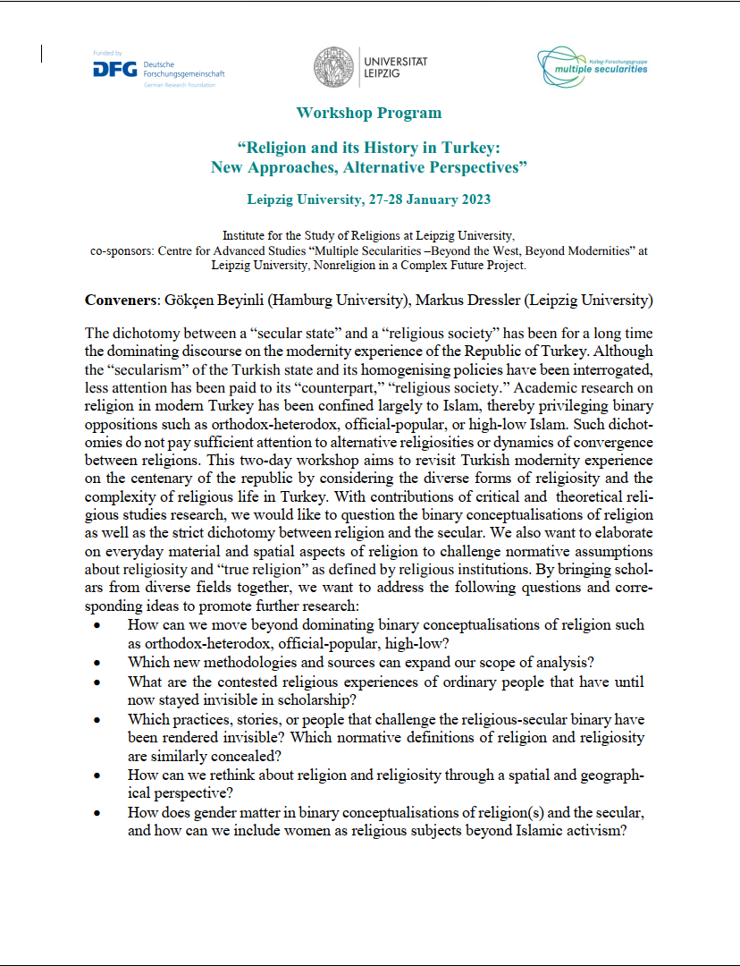 Bölümümüzün hocalarından Zeynep Oktay 27-28 Ocak 2023 tarihlerinde Leipzig Üniversitesi’nde düzenlenecek olan “Religion and its History in Turkey: New Approaches, Alternative Perspectives” çalıştayında “The History of Popular Religion in Turkey: Conceptual and Methodological Issues” başlıklı bir bildiri sunacaktır. Programı indirmek için tıklayınız.