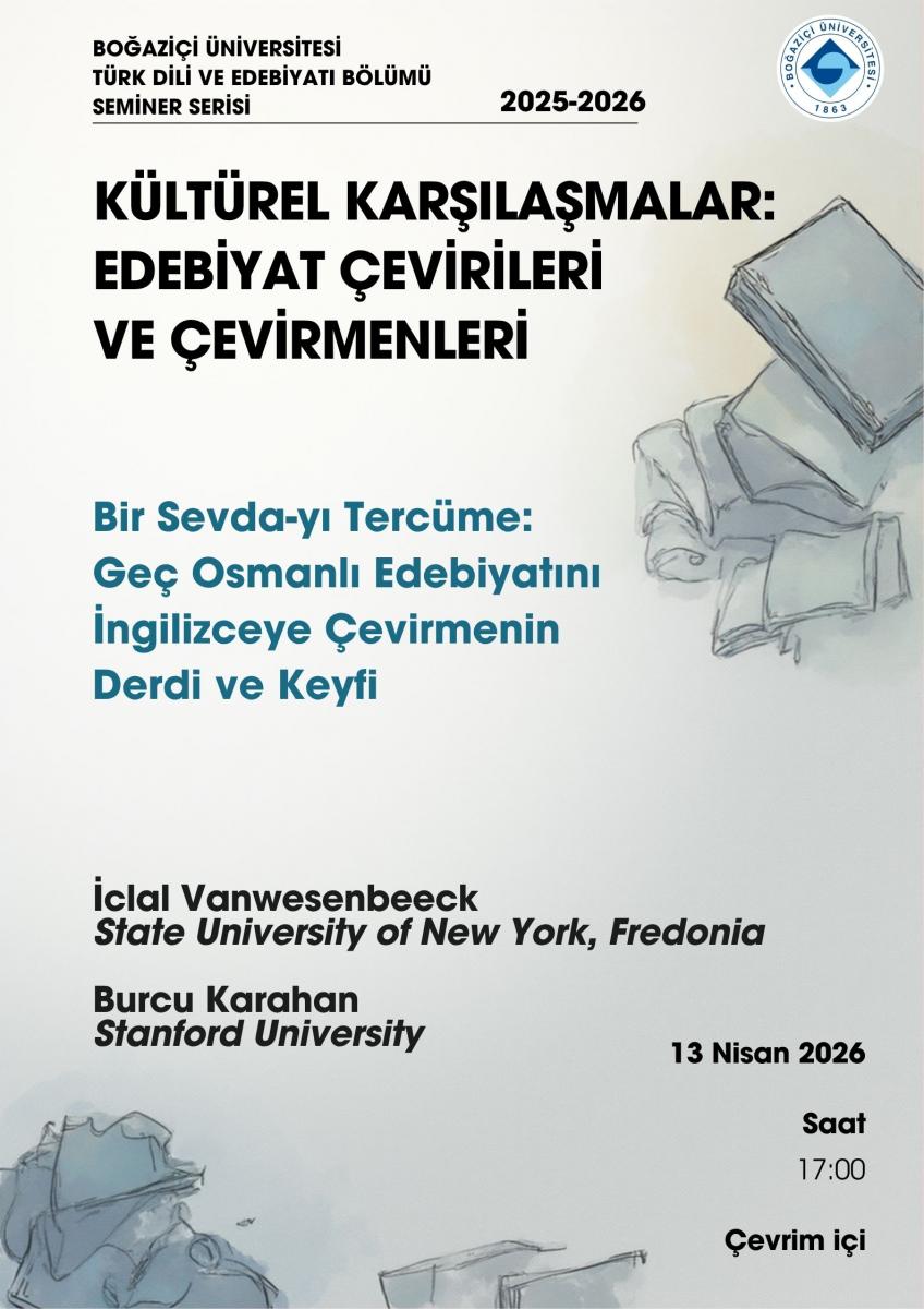 Kültürel Karşılaşmalar: Edebiyat Çevirileri ve Çevirmenleri-"Bir Sevda-yı Tercüme: Geç Osmanlı Edebiyatını İngilizceye Çevirmenin Derdi ve Keyfi”- İclal Vanwesenbeeck ve Burcu Karahan, 13 Nisan Pazartesi, 17.00, Çevrim içi (Link için tıklayınız.)