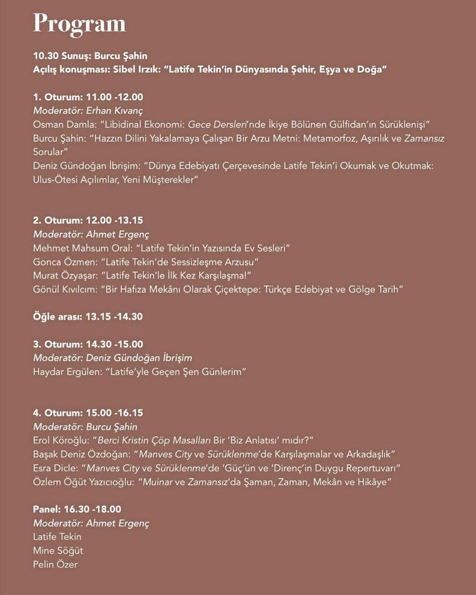Sabancı Üniversitesi tarafından düzenlenen, 25 Kasım’da gerçekleşecek Latife Tekin Sempozyumu’nda, bölümümüzün mensuplarından ve mezunlarından Esra Dicle, Erol Köroğlu ve Başak Deniz Özdoğan da birer bildiri sunacaktır.
