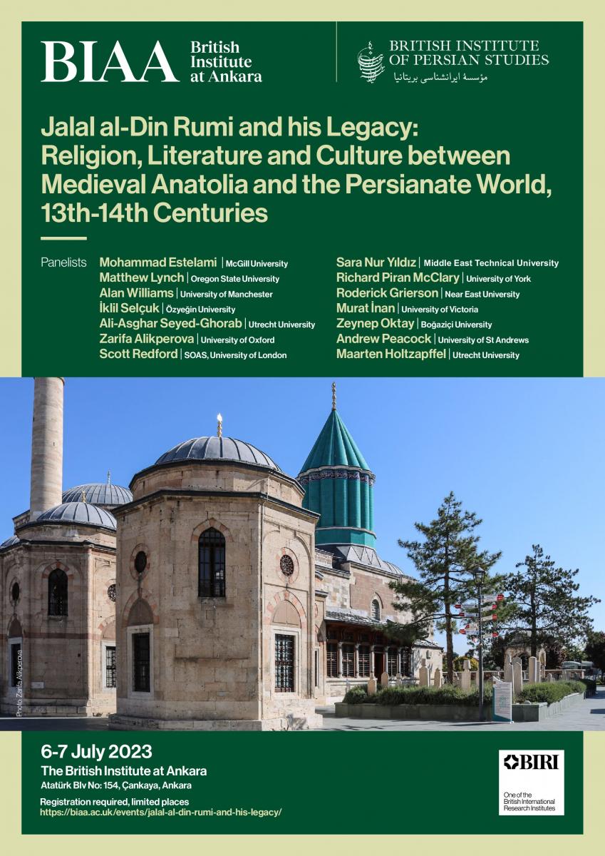 Bölümümüzün hocalarından Zeynep Oktay'ın "The Masnavi Genre Between Orality and Literacy in Fourteenth Century Anatolia" başlıklı bildirisiyle katkıda bulunacağı Jalal al-Din Rumi and his Legacy: Religion, Literature and Culture between Medieval Anatolia and the Persianate World, 13th-14th Centuries konferansı 6-7 Temmuz 2023 tarihlerinde BIAA Ankara'da (Atatürk Bulvarı 154, Çankaya, Ankara) gerçekleşecek. Katılım için kayıt yaptırmak zorunludur. Etkinlik programı ve kayıt formu için tıklayınız.