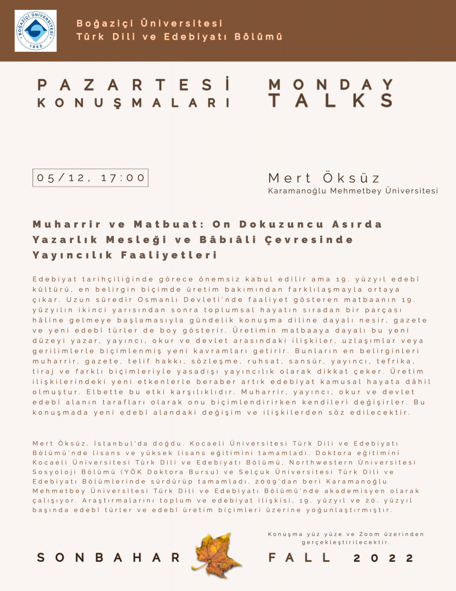 Muharrir ve Matbuat: On Dokuzuncu Asırda Yazarlık Mesleği ve Bâbıâli Çevresinde Yayıncılık Faaliyetleri (Mert Öksüz, 5 Aralık 2022)