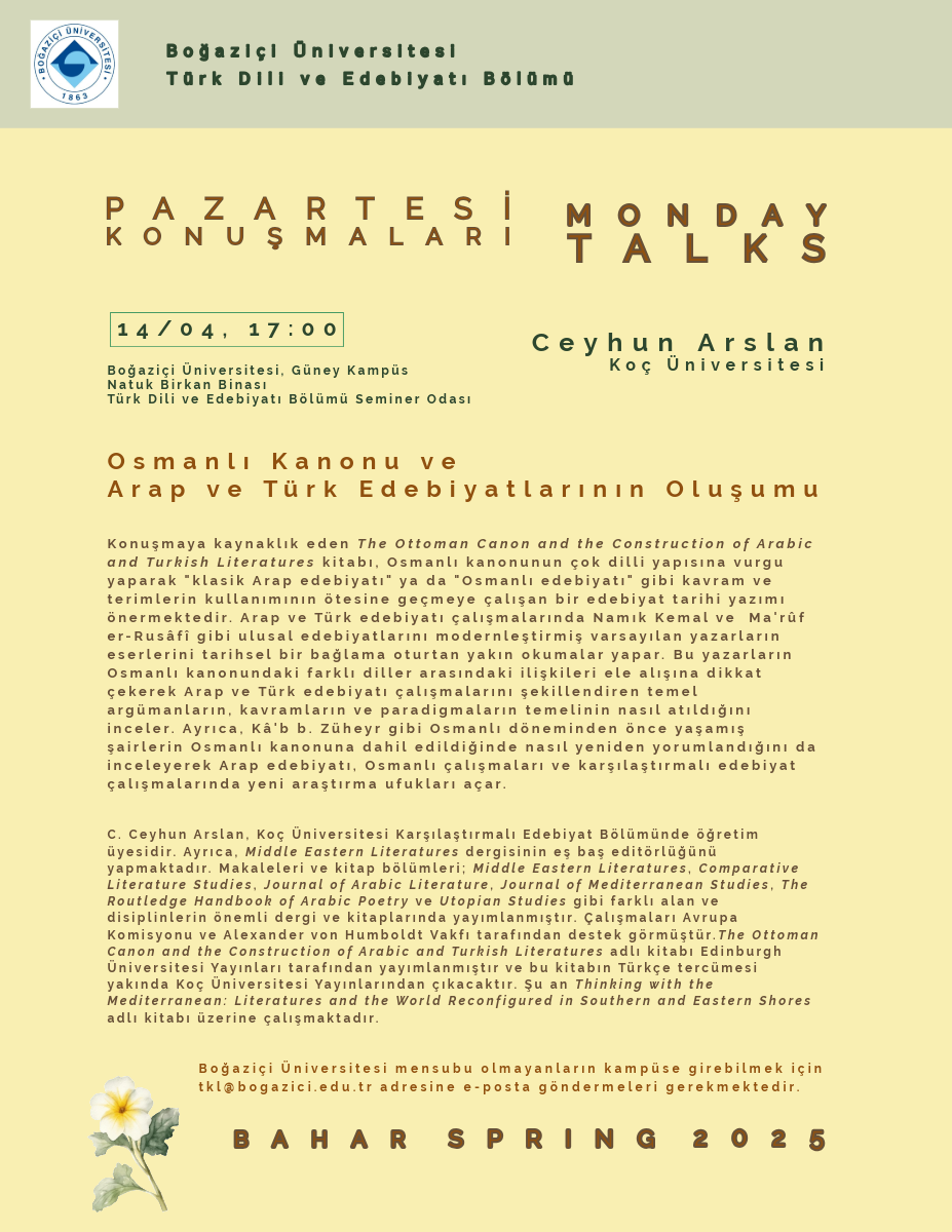 Pazartesi Konuşmaları’nın bir sonraki konuğu Ceyhun Arslan! “Osmanlı Kanonu ve Arap ve Türk Edebiyatlarının Oluşumu” 14 Nisan Pazartesi günü saat 17:00’de Natuk Birkan Binası’nda, Türk Dili ve Edebiyatı Bölümü Seminer Odası’nda!