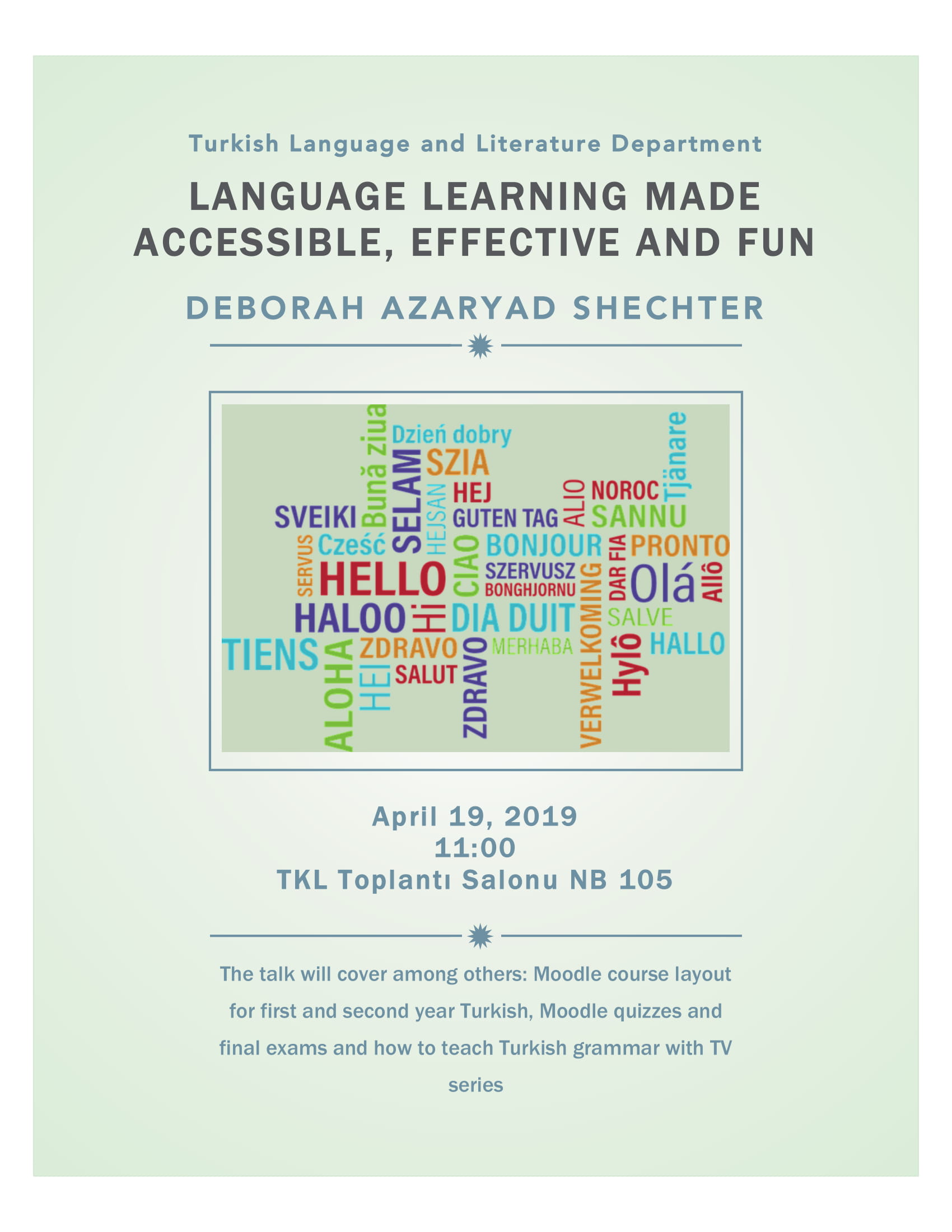 Deborah Azaryad Shechter teaches Advanced English and Turkish courses at Tel Aviv University. Her fields of specialization include test-writing, course site design on Moodle, curriculum and materials development, and teacher education. She is currently exploring the teacher’s role in student motivation and the connection between positive emotions and learning. Her recent article “Overcoming the grammar barrier in foreign language learning: the role of television series” can be found at: https://jle.hse.ru/article/view/7521