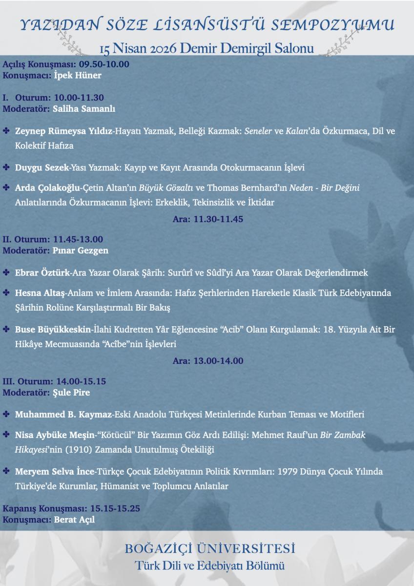 Yazıdan Söze Lisansüstü Sempozyumu 15 Nisan Çarşamba günü, 9.50-15.25 saatleri arasında Demir Demirgil Salonu'nda düzenlenecek. (Oturumlar için tıklayınız.)